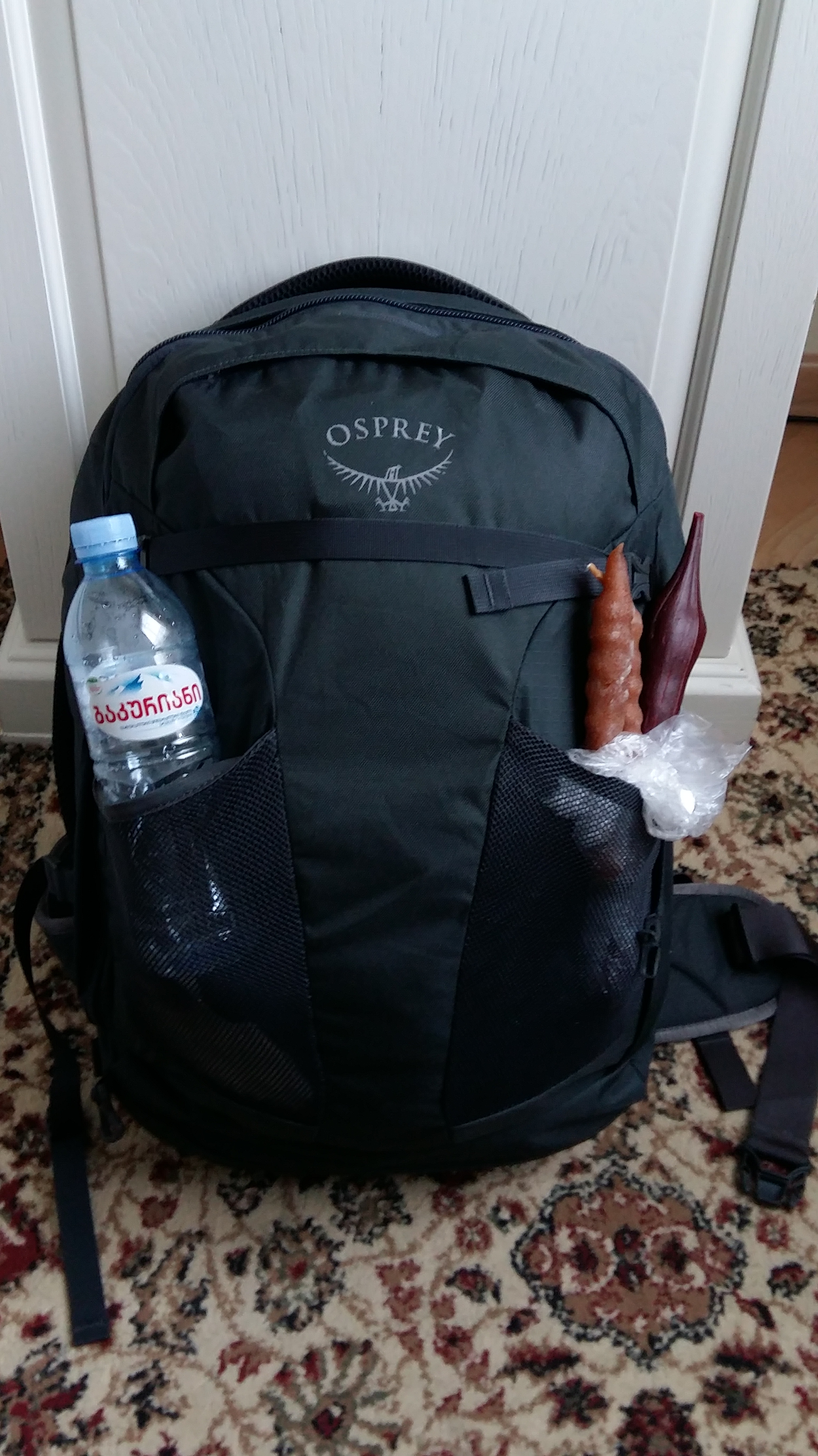 I brought only carry-on luggage to Georgia, so that I wouldn’t be delayed in airports and my bags wouldn’t go astray. I think I had just the right amount of gear, since I used everything, but didn’t feel I left anything important at home. It all fit in a 40 litre backpack and a handbag. Here’s what I brought, including what I was wearing on the day I set out. This was for a two-week trip in late May and early June, including both city sightseeing and mountain hiking. It required doing a small load of laundry twice during my trip.