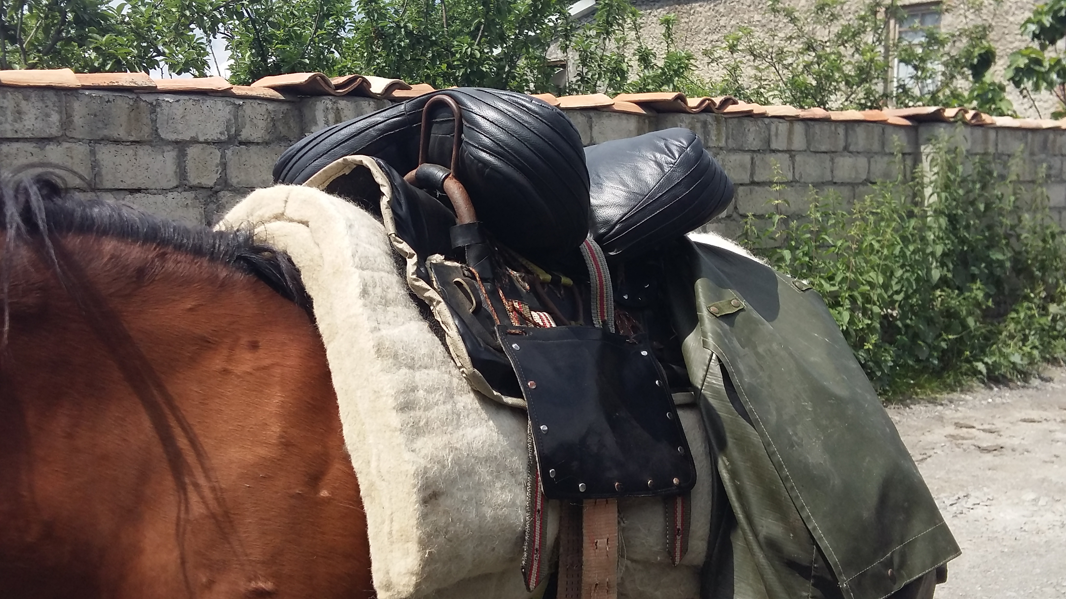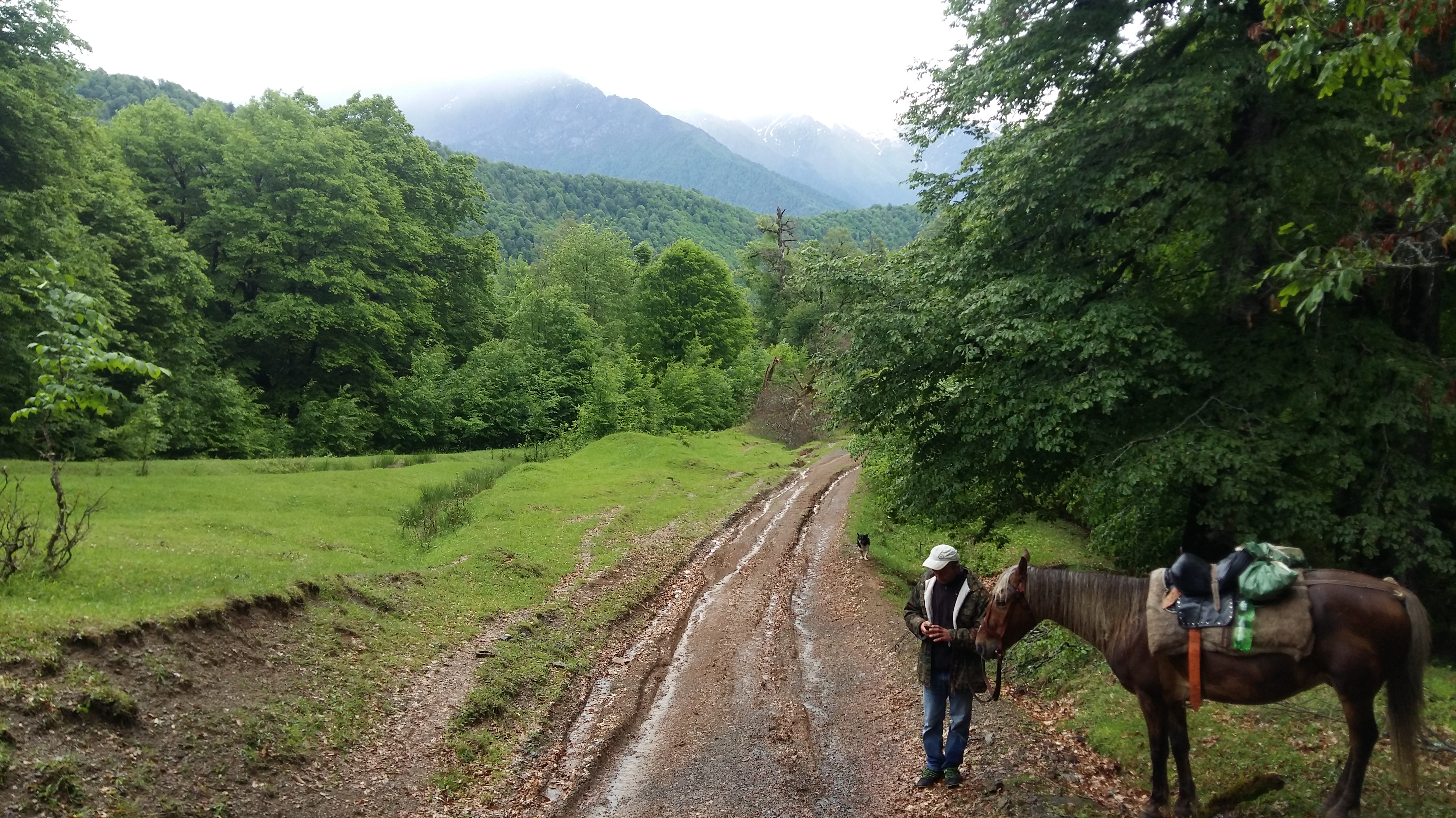 As it transpired, a cloudburst farther up the trail dropped twenty minutes of hail on us, though it had been hot and sunny in the valley. We dismounted and hunkered down in the bush under our rain gear until it passed. Now I understand the utility of a nabadi, the thick cloak of black felt that is part of the traditional folk clothing of these regions. One of those would have been really handy!