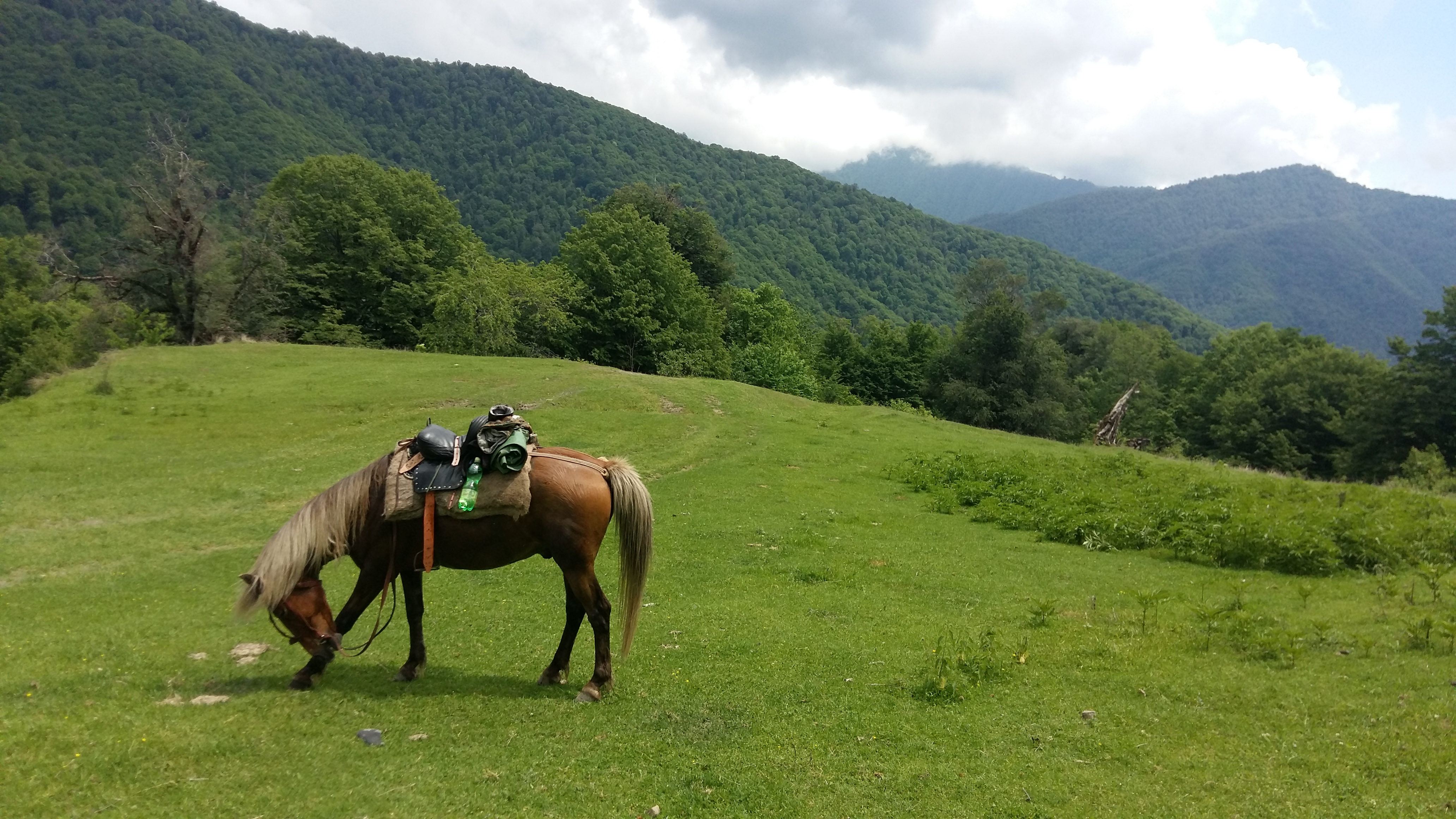 The next morning, after my visit to the library, I went horseback riding in the mountains above Pankisi. This tour too had been arranged by my hostess, Nazy. My guide was Avto, an affable local man. He came to the guesthouse gate with two horses, which I was happy to see were healthy looking and recently shod.
